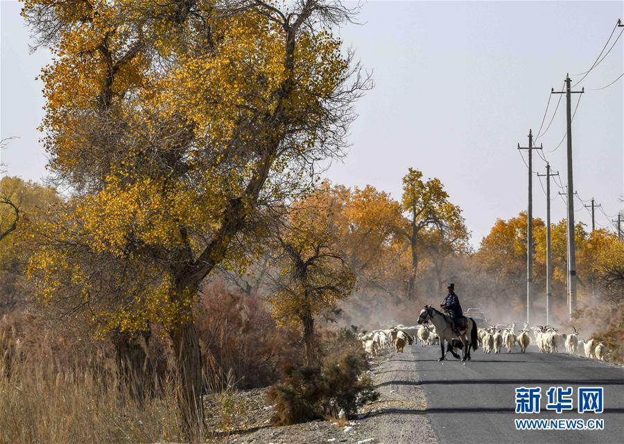 在新疆尉犁县喀尔曲尕乡,牧羊人马木提·买买提在胡杨边上的道路上牧羊(10月25日摄)。 10月中下旬,静静的塔里木河中下游一片金黄。胡杨深处,条条小路蜿蜒绵长通向远方,引人入胜。 塔里木河是中国最长的内陆河,这一区域原始胡杨林分布较为集中。随着塔里木河连续19次向下游生态输水,为胡杨林“解渴”,塔河两岸生态得到明显改善,沙地面积逐年减少。 新华社记者赵戈摄