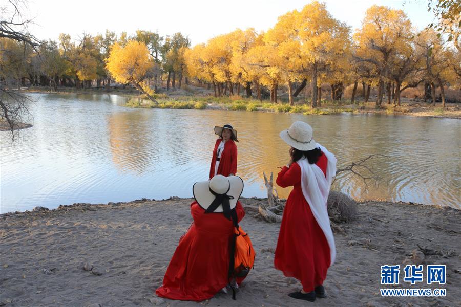 10月10日,在内蒙古自治区额济纳旗,游客在胡杨林前留影。 金秋时节,内蒙古自治区额济纳旗胡杨林如同披上金装,成为大漠中的一抹亮色,吸引众多中外游客前来观赏游玩。 新华社记者安希雅摄