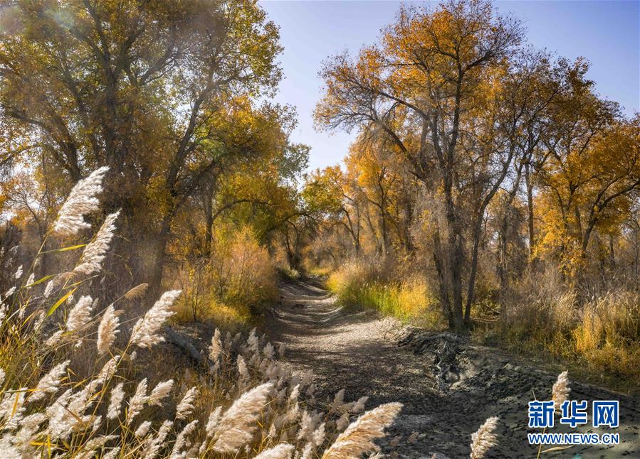 新疆轮台县胡杨林深处的一条小路(10月25日摄)。 10月中下旬,静静的塔里木河中下游一片金黄。胡杨深处,条条小路蜿蜒绵长通向远方,引人入胜。 塔里木河是中国最长的内陆河,这一区域原始胡杨林分布较为集中。随着塔里木河连续19次向下游生态输水,为胡杨林“解渴”,塔河两岸生态得到明显改善,沙地面积逐年减少。 新华社记者赵戈摄