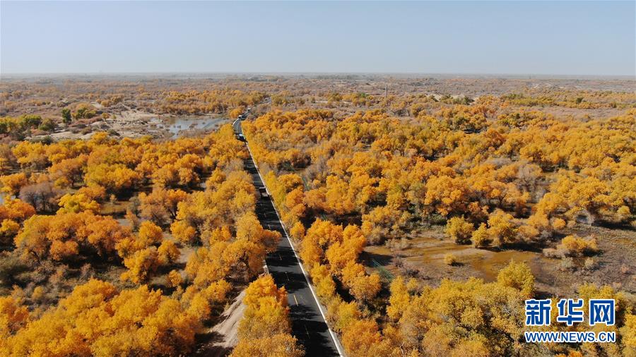 从空中俯瞰新疆尉犁县喀尔曲尕乡,两条道路沿着塔里木河岸边的金色胡杨向前延伸(10月25日无人机拍摄)。 10月中下旬,静静的塔里木河中下游一片金黄。胡杨深处,条条小路蜿蜒绵长通向远方,引人入胜。 塔里木河是中国最长的内陆河,这一区域原始胡杨林分布较为集中。随着塔里木河连续19次向下游生态输水,为胡杨林“解渴”,塔河两岸生态得到明显改善,沙地面积逐年减少。 新华社记者赵戈摄