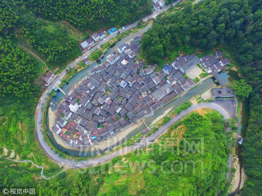 小河呈大半圆形,绕村庄将近一周,四周高山环绕,新修的柏油公路沿着河流呈圆弧形绕村而过,一些木板桥与公路相连。