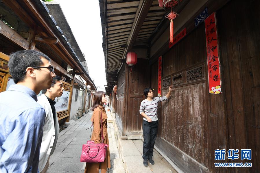 10月27日,琴江满族村游客服务中心的郑闽琼(右一)向游客介绍三江口清朝水师旗营古兵房建筑特色。福州市长乐区琴江满族村是福建省唯一的满族聚居村,也是我国东南沿海保存较为完整的清代水师城堡。清雍正六年(1728年)时,清政府在此建立“福州三江口水师旗营”,镇守闽江口,拱卫省城,缉捕海盗,打击走私。这里成为当时全国四大水师旗营之一,随后逐渐成为一个居民小镇。有近300年历史的琴江村既有军事历史背景,又有民族文化特色,2010年成为“中国历史文化名村”。新华社记者 林善传 摄