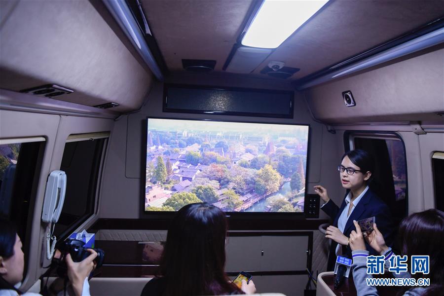 在浙江移动乌镇分水墩营业厅外,工作人员在一辆体验巴士内介绍通过5G移动传输技术实现的8K高清的视频画面实时展示(10月30日摄)。 新华社记者黄宗治摄