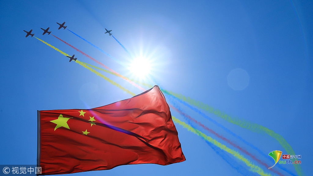 2018年11月7日,空军红鹰队在广东省珠海市第十三届中国航空航天博览会上进行飞行表演。视觉中国