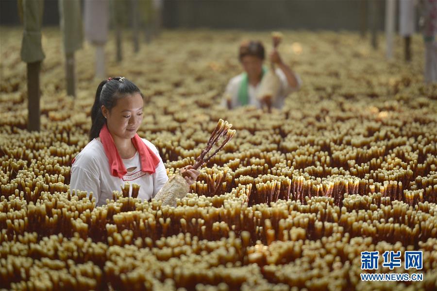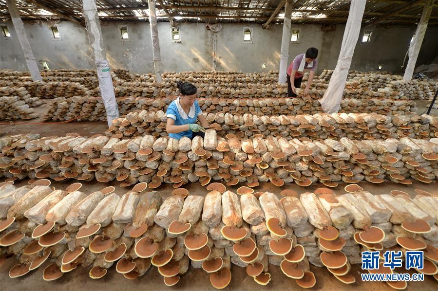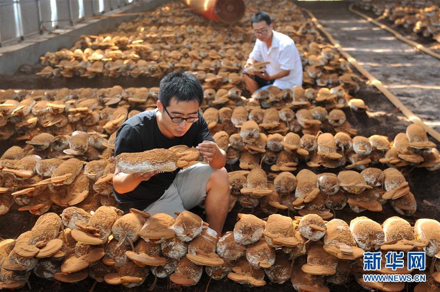 8月22日,河北省沙河市蝉房乡水磨头村农民在大棚内管理种植的灵芝。 新华社记者 牟宇 摄