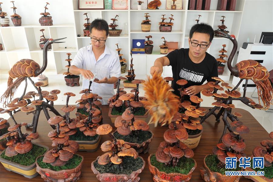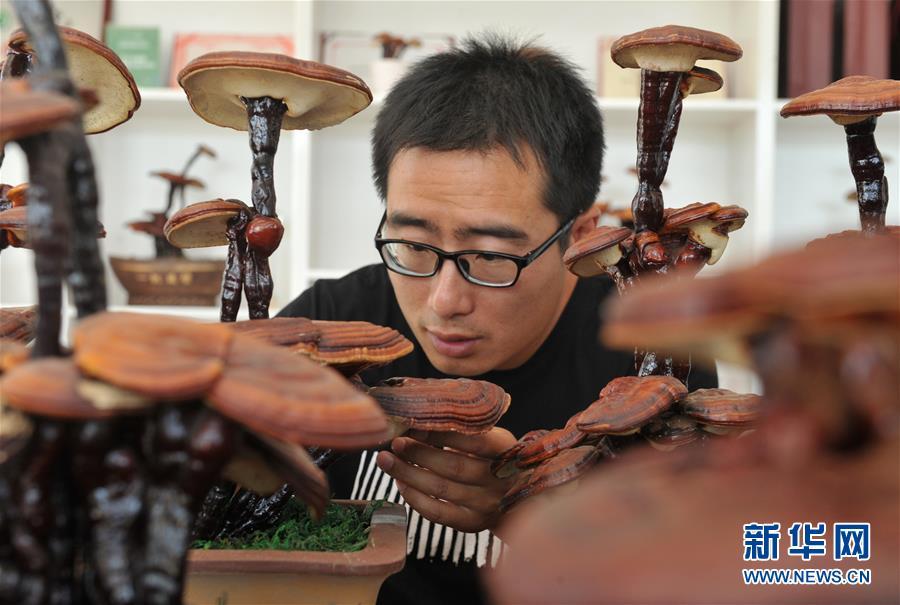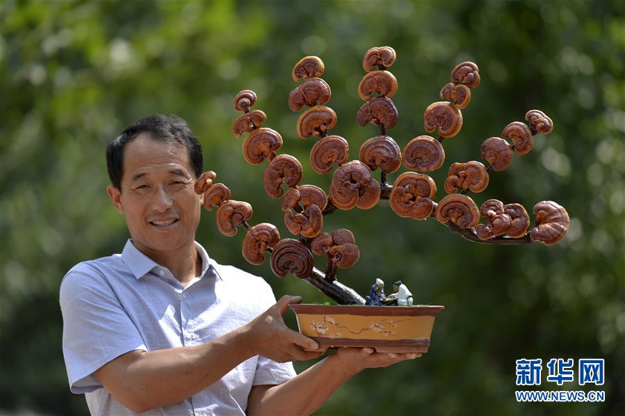 6月20日,广宗县大柏社村村民王志恒在展示制作的灵芝盆景。 近年来,河北省广宗县大柏社村积极引导农民结合市场需求调整农业产业结构,采取“公司+合作社+基地+农户”的经营模式,发展特色灵芝种植,并开发出灵芝盆景、灵芝孢子粉等相关衍生产品,开辟出一条富农创收新路径。目前,大柏社村灵芝种植面积近百亩,种植各类灵芝5000余株,带动120余名农民就业增收。新华社记者朱旭东摄