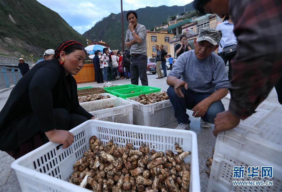 8月14日,在雅江县城,收松茸的客商(右二)与村民讨价还价。 每年7至9月,是四川省雅江县松茸采摘、交易、加工的最佳季节。近两年来,当地政府采用“产地+电商+冷链物流”“微商+专业合作社”等模式引进物流企业,快递覆盖全国多座城市。截至目前,通过快递行业销售松茸2000余吨,带动松茸产区户均增收6000元。今年雅江县报批松茸出口1812.5吨,预计出口创汇5亿元。 新华社记者 江宏景摄