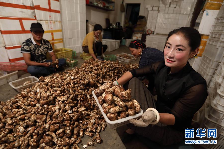 8月14日,在雅江县城,收松茸的客商达瓦卓玛在展示分拣后的松茸。 新华社记者 江宏景摄