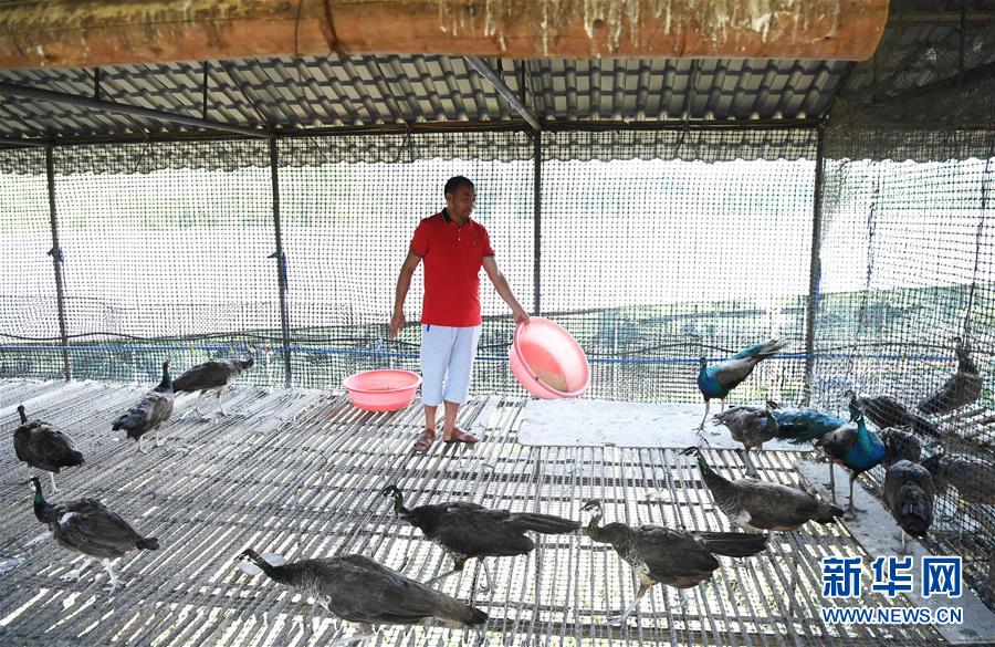 5月16日,在重庆市铜梁区永嘉镇高龙村,阎仁兵在养殖场内给蓝孔雀喂食。 新华社记者 王全超 摄