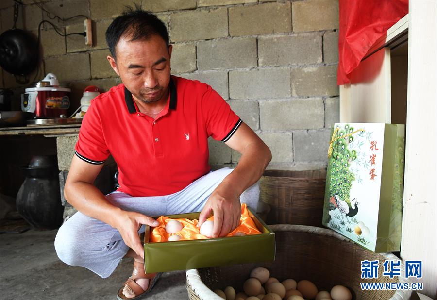 5月16日,在重庆市铜梁区永嘉镇高龙村,阎仁兵在包装孔雀蛋。 新华社记者 王全超 摄