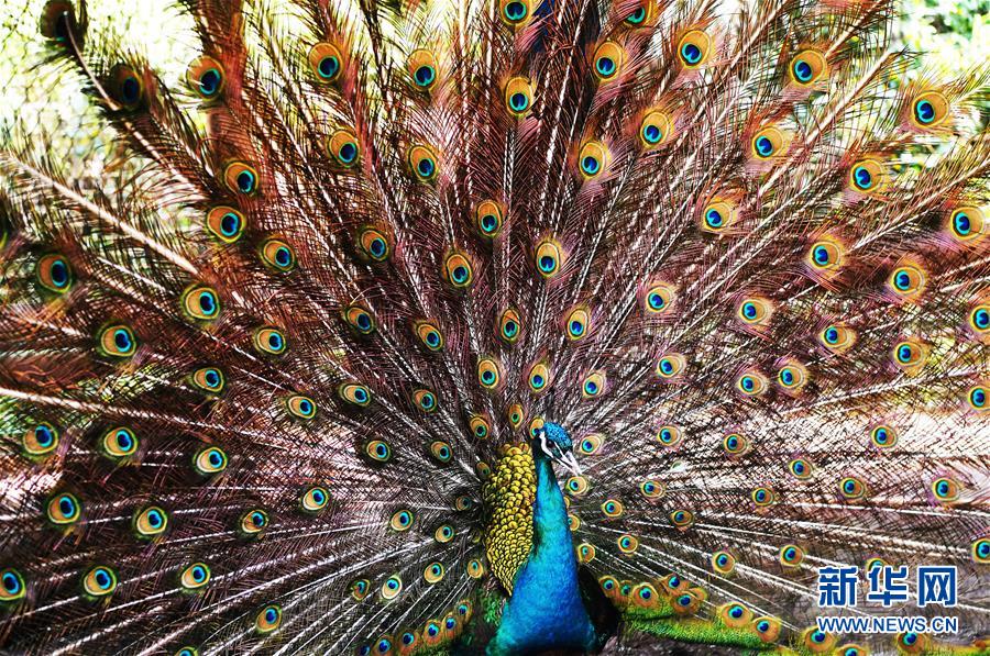 5月16日,在重庆市铜梁区永嘉镇高龙村蓝孔雀养殖场内,一只蓝孔雀开屏。 新华社记者 王全超 摄 |