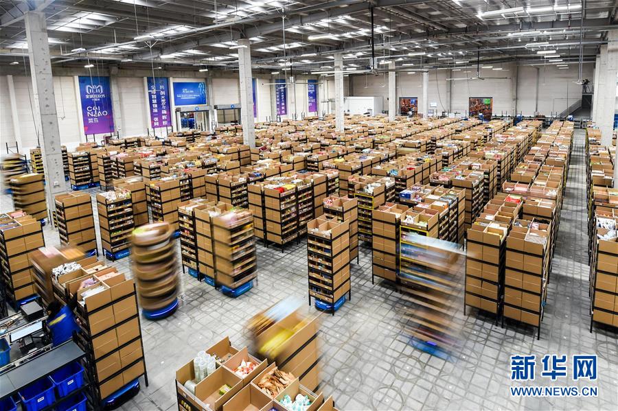 11月8日,智能搬运机器人在仓库内进行搬运作业。 新华社记者 李博 摄