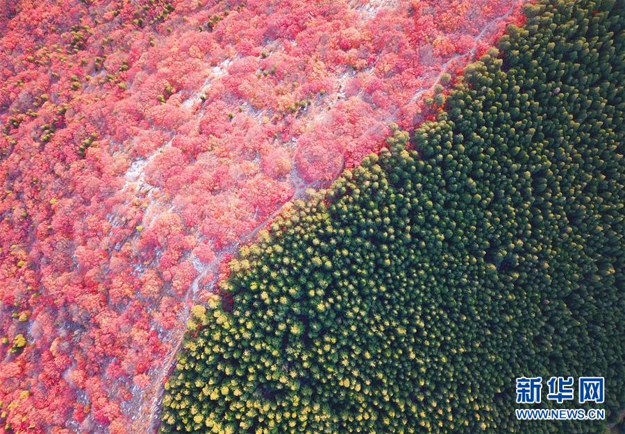 深秋时节,山东济南楔子山山脊两边种植的植被形成“一山双色”景观,令人称奇。
