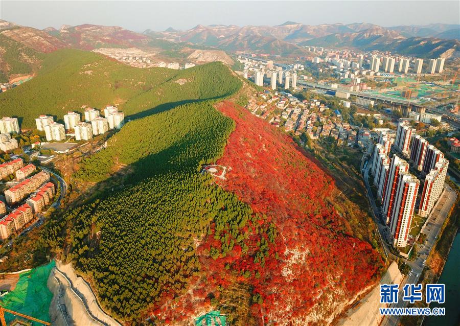 这是“一山双色”的山东济南楔子山(10月31日无人机拍摄)。 新华社记者朱峥摄