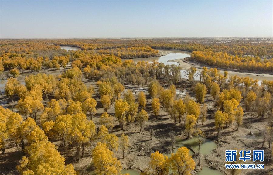 这是从空中俯瞰新疆巴音郭楞蒙古自治州尉犁县的金色胡杨(10月25日无人机拍摄)。 新华社记者 赵戈 摄