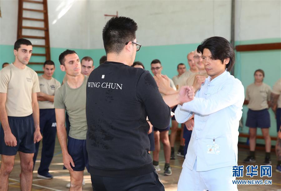 11月13日,在马耳他首都瓦莱塔,郑祖杰(前右)向马耳他士兵展示咏春拳。 当日,中国国家级非物质文化遗产咏春拳代表性传承人郑祖杰走进马耳他武装部队,向官兵展示咏春拳。这一活动是马耳他中国文化中心与马耳他武术协会合办的咏春拳系列展示活动之一。 新华社记者 袁韵 摄