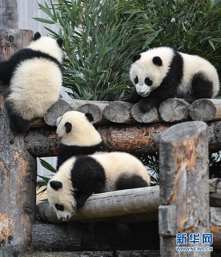 这是在中国大熊猫保护研究中心卧龙神树坪基地拍摄的三只大熊猫(2018年4月25日摄)。 新华社记者 薛玉斌 摄