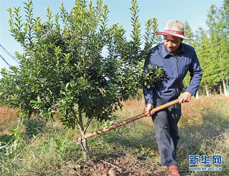舒港发在自家田地给杨梅树除草(10月27日摄)。