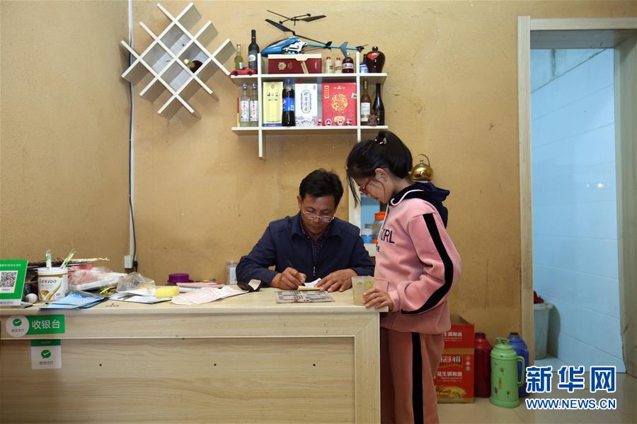 舒港发在自家的酒店里记账,旁边站着的是他的孙女(10月28日摄)。