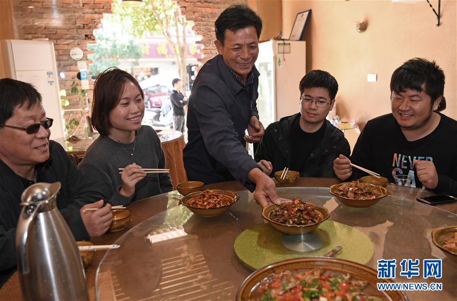 舒港发在自家的酒店里招待游客(10月28日摄)。