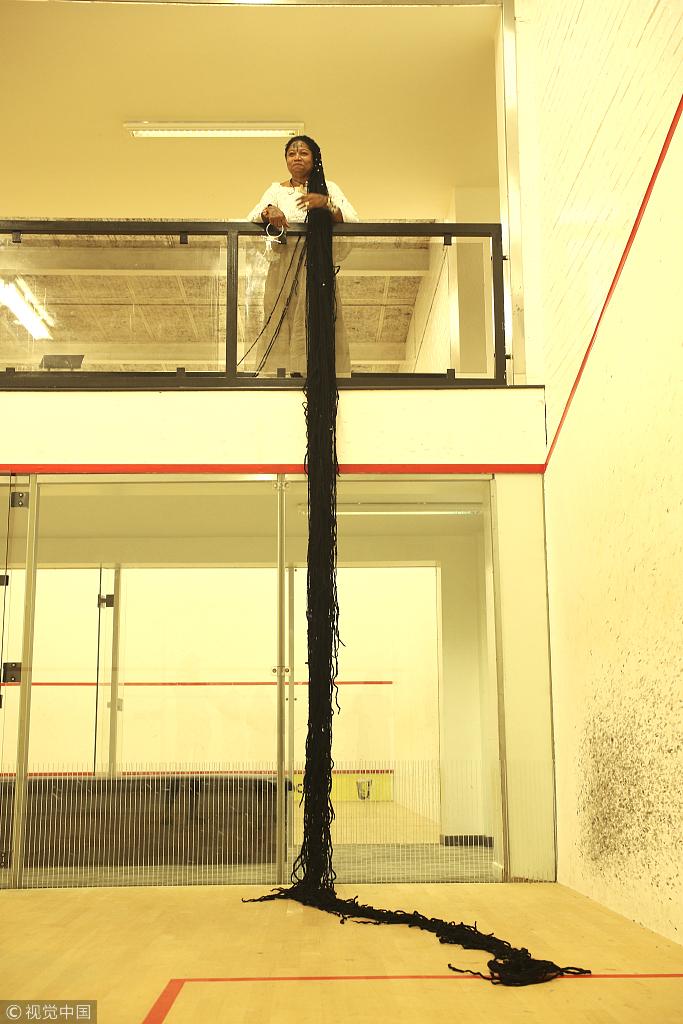 当地时间2018年9月14日,英国韦灵伯勒,正在英国旅行的Asha Mandela来自美国佛罗里达州,是世界上头发最长的女人。