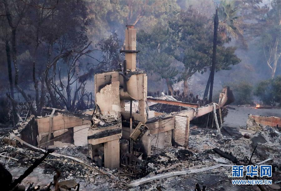 这是11月10日在美国加利福尼亚州马里布市拍摄的一处被烧毁的废墟。连日来,美国加利福尼亚州野火肆虐。 新华社记者李颖摄