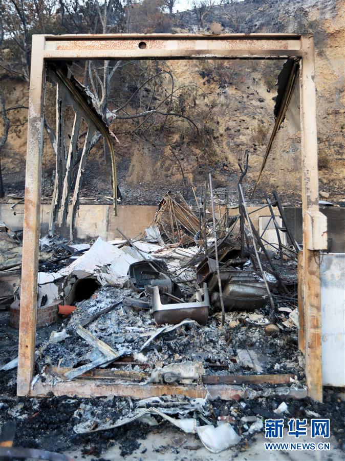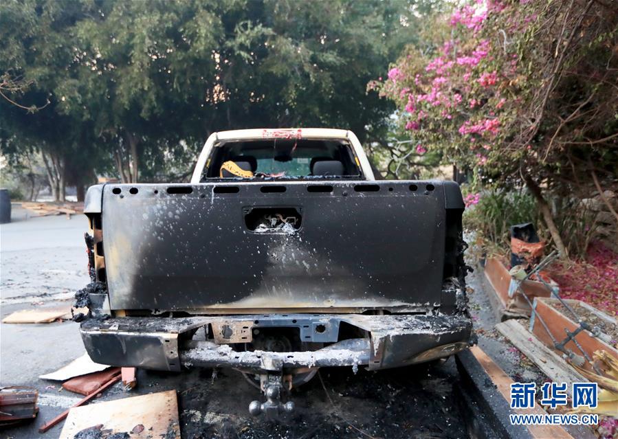 这是11月10日在美国加利福尼亚州马里布市拍摄的一辆被烧毁的汽车。连日来,美国加利福尼亚州野火肆虐。 新华社记者李颖摄