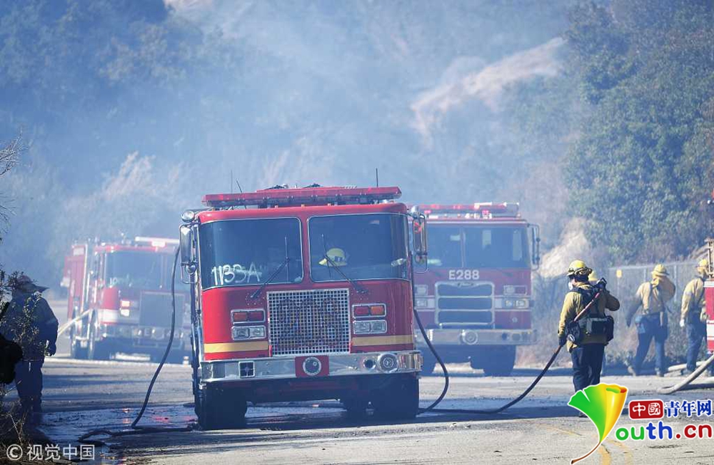 该郡第二大城市千橡树市(Thousand Oaks)等很多地方房屋被毁,高速公路封闭,居民紧急疏散。洛杉矶郡圣盖博市(San Gabriel)警察局警官日瓦戈(O. Zhivaga)和同事们当天清晨即受命驰援文图拉郡,保护当地居民和财产安全。图为消防车行驶在已封闭的公路上,天空中浓烟滚滚。