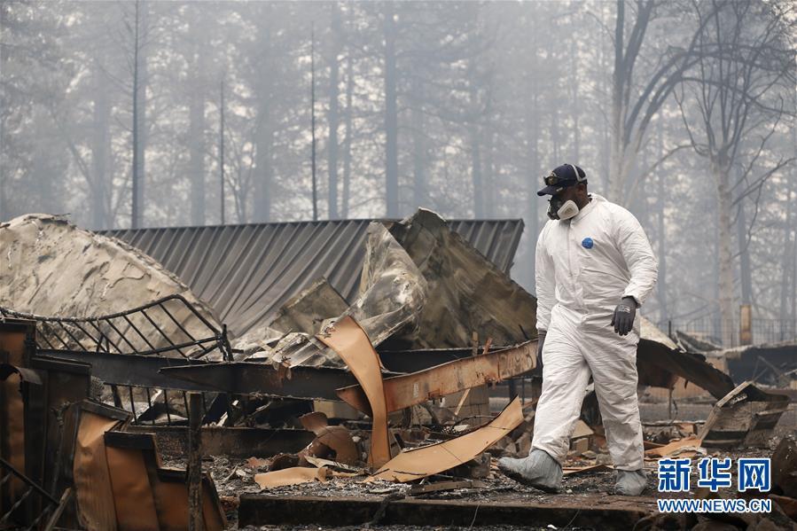 11月19日,在美国加利福尼亚州比尤特县天堂镇,救援人员在山火废墟中工作。新华社记者吴晓凌摄