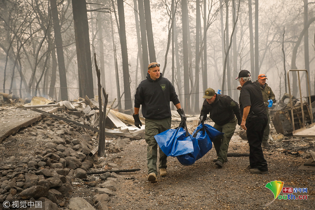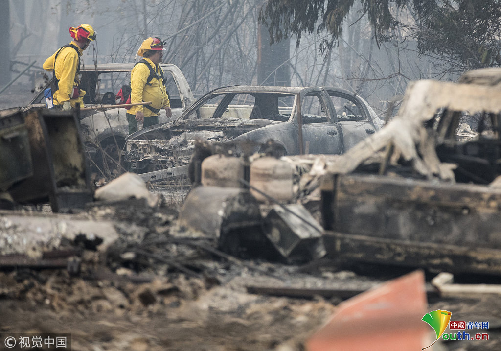 11月13日,在美国加利福尼亚州天堂镇,搜救人员在山火过后的废墟工作。