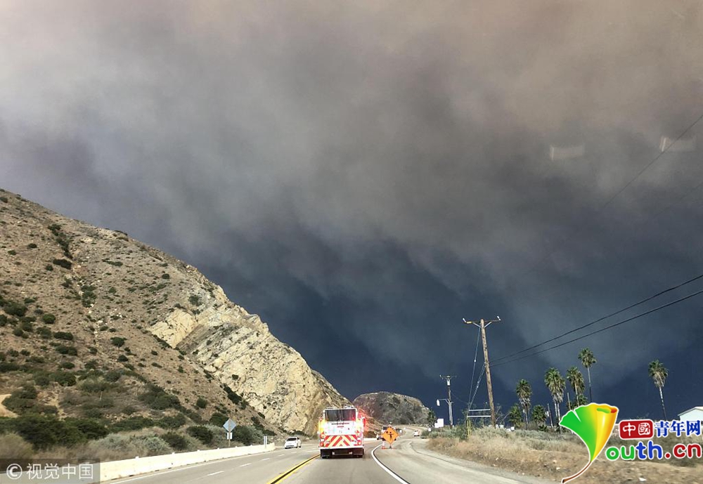 当地时间11月9日下午,美国加利福尼亚州南部文图拉郡(Ventura County)等地熊熊山火已延烧逾万英亩,浓烟遮天蔽日。
