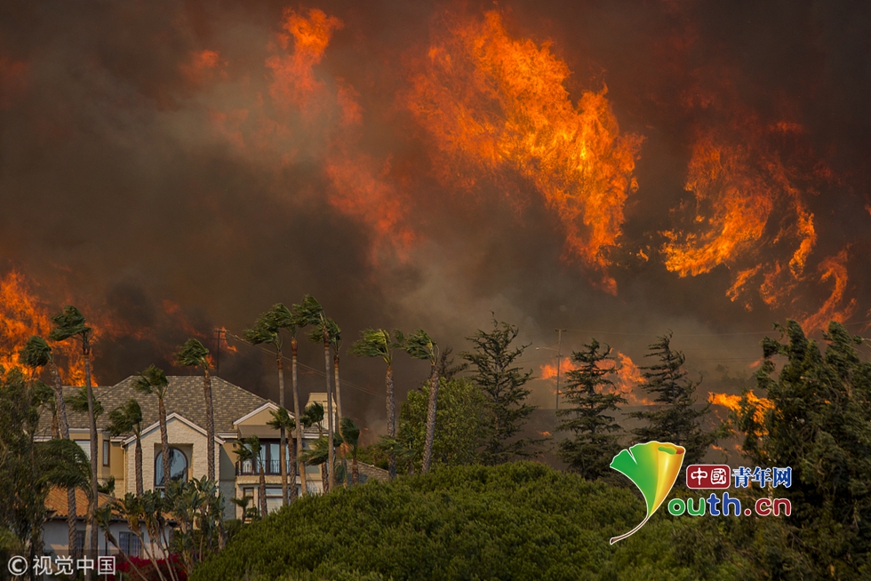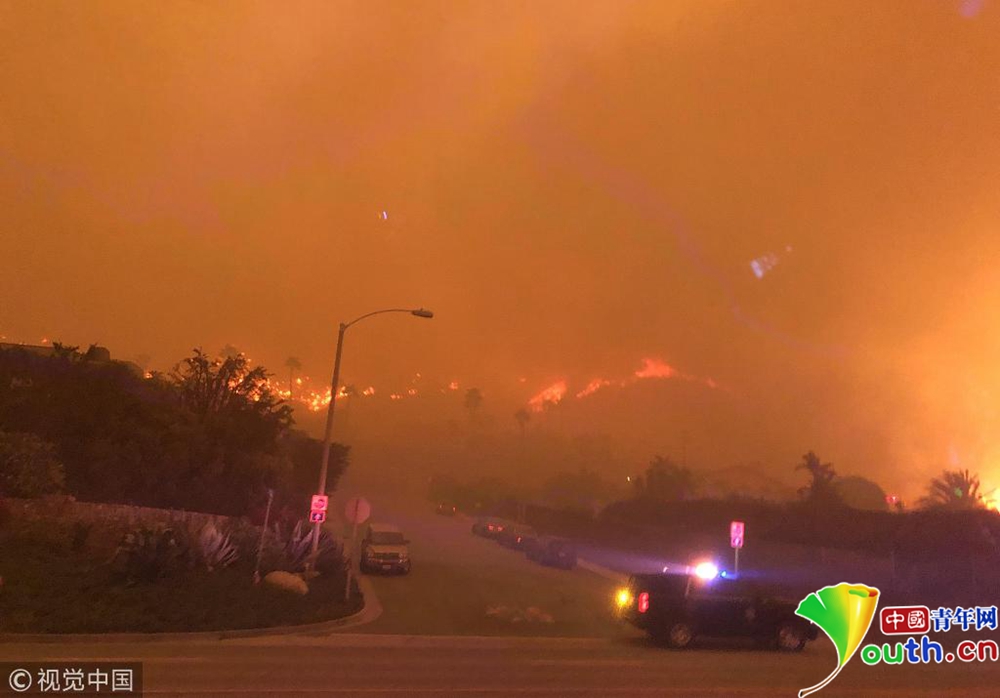 山火迅速蔓延至刚刚发生枪击案的千橡树市,并在9日翻过圣莫妮卡山,在强风的助力下向海边蔓延。