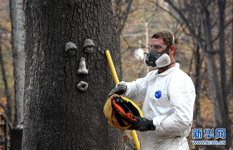 11月19日,在美国加利福尼亚州比尤特县天堂镇,救援人员在山火废墟中工作。新华社记者吴晓凌摄