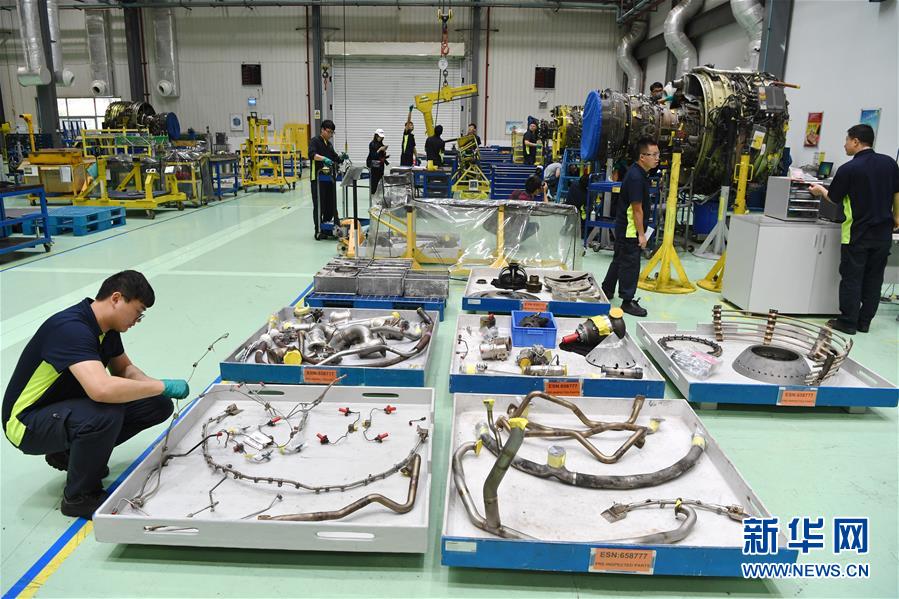 11月15日,在福建自贸区厦门片区的新科宇航科技有限公司航空维修车间内,技术人员在拆解飞机发动机。新华社记者姜克红摄