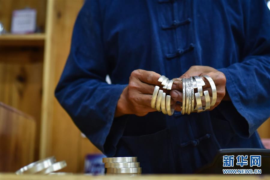 8月3日,银匠龙懂阳在银饰店内清点制作完成的银质手镯。