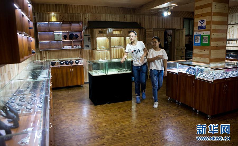 8月3日,前来体验银饰制作的青少年参观龙太阳的银饰陈列展台。