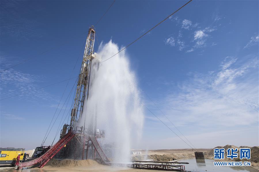 11月21日,在埃及明亚省,地下水从水管里喷涌而出。 2017年,中国中曼石油公司与阿联酋海湾集团签订合同,为该集团在埃及沙漠中的大型农业项目钻探300口水井。根据合同,中曼石油将先期完成30口井的试钻探,剩余水井将以每月7口的速度交付。目前有超过200名工人在钻井现场作业,大部分是埃及本地人。 新华社记者李碧念摄