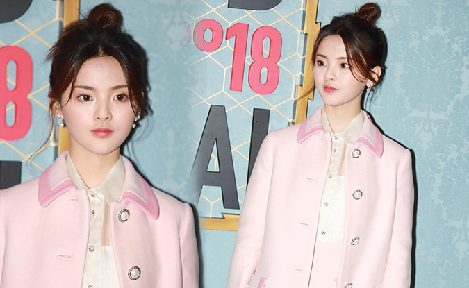 杨超越穿粉色大衣娴静优雅 扎丸子头 ...