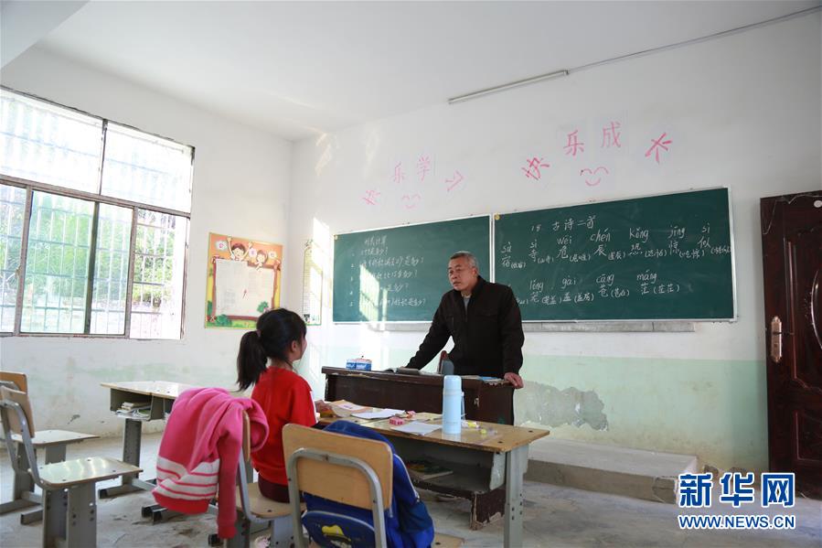 11月29日,在湖南省永州市冷水滩区黄阳司镇天里坪村小学教学点,55岁的唐炳元在给7岁的陈宏荟上课,该教学点只有一名老师一名学生。 55岁的唐炳元已是满头白发,他身后的墙壁上有两块黑板,一块写着数学题,一块写着汉字和拼音。空荡的教室内,只摆有4张课桌。在今年上半年,班上还有4名学生,到下半年就只剩下1名了。