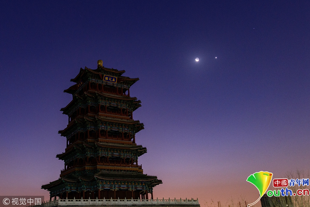 北京,天宇上演“金星合月”,清晨5点时,东南方低空出现一颗明亮的金星和一弯窄月近距离相依相伴的美丽画面。
