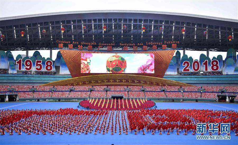 12月10日,广西壮族自治区成立60周年庆祝大会在广西体育中心隆重举行。这是庆祝大会上的群众文艺表演。 新华社记者 李学仁 摄