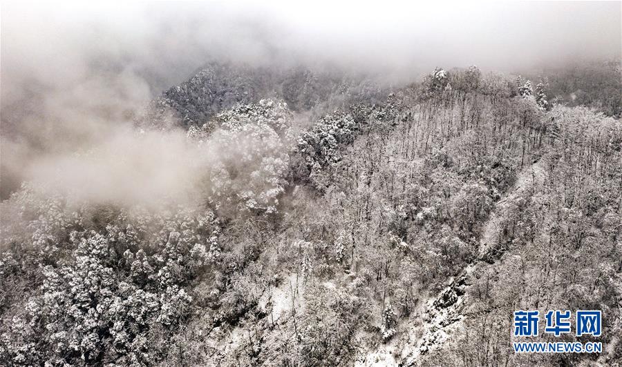 11月8日无人机拍摄的银装素裹的鬼谷岭国家森林公园主峰。 新华社记者陶明摄