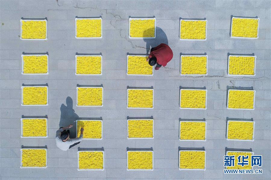 2018年11月7日,河北省魏县魏城镇町上村农民在分拣晾晒菊花。 大地之色,俯仰之间;壮美山河,是我的祖国。2018年,新华社记者操纵无人机“飞阅”华夏大地,在最美的时节,定格下她的色彩斑斓。 新华社记者 朱旭东 摄