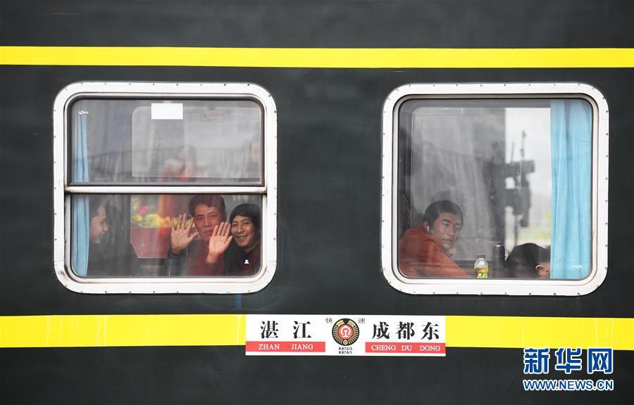 1月5日,在一列停靠在重庆合川站的列车上,乘客向站台挥手致意。 自1月5日零时起,全国铁路实施新的列车运行图。 新华社记者 王全超 摄