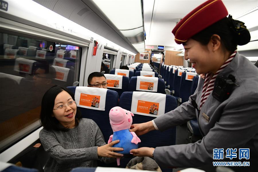 1月5日,在当日新开行的西安北至杭州东的列车上,乘务员向旅客赠送礼物。 自1月5日零时起,全国铁路实施新的列车运行图。新华社记者 李一博 摄