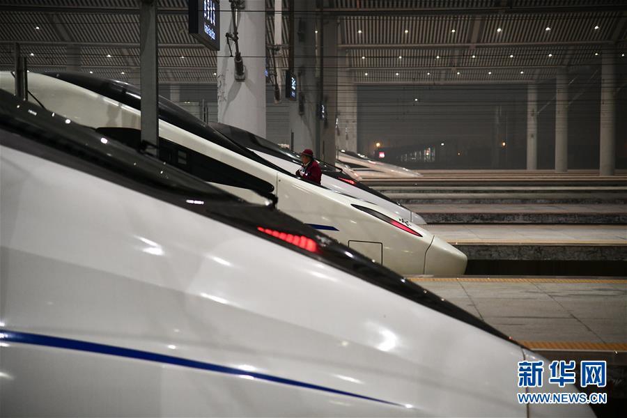 1月5日,铁路工作人员在西安北站检查动车组列车。 自1月5日零时起,全国铁路实施新的列车运行图。 新华社记者 李一博 摄