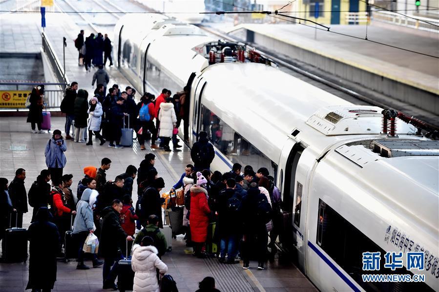 1月5日,旅客在济南站排队上车。 自1月5日零时起,全国铁路实施新的列车运行图。 新华社记者王凯摄