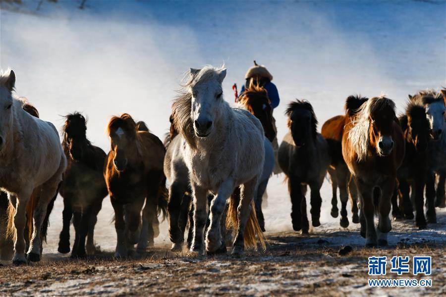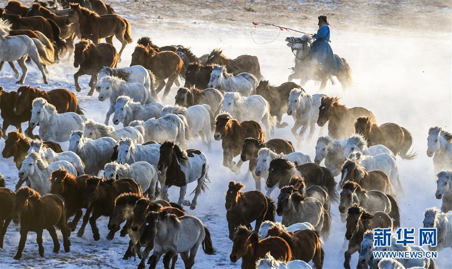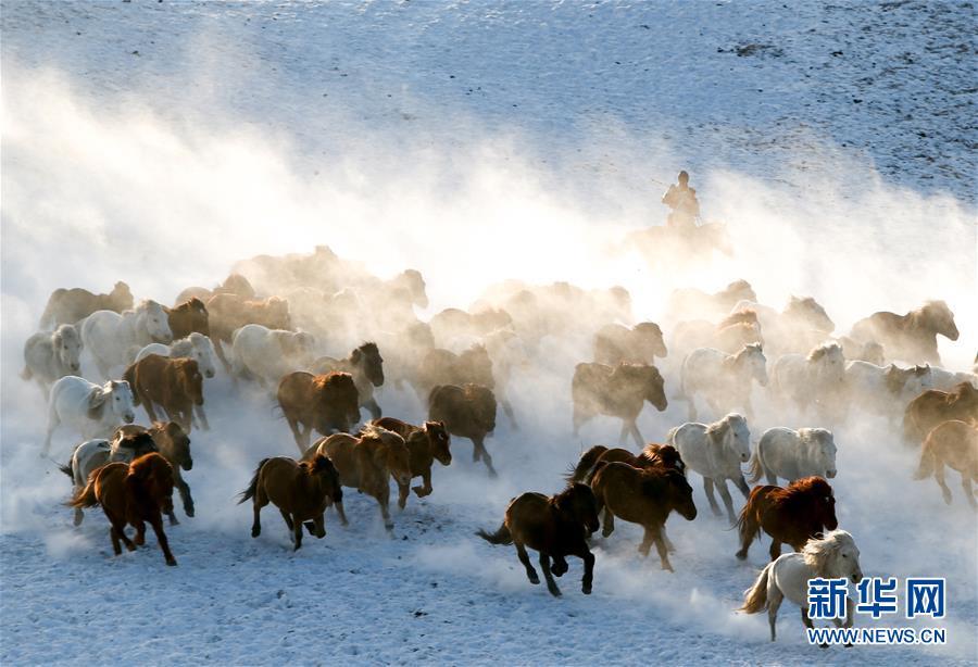 时下正值内蒙古冬季旅游旺季,赤峰市克什克腾旗的乌兰布统草原银装素裹。当地牧民赶着马匹,来到雪原上驯马,为八方游客呈现了雪原奔马的壮观景象。 新华社记者彭源摄