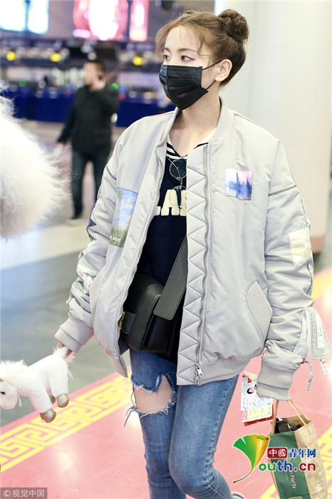 2019年1月14日,北京,杨超越现身机场。她扎哪吒头活力十足,甩玩偶淘气回眸,穿破洞裤露美腿,披面包服似自带鼓风机。