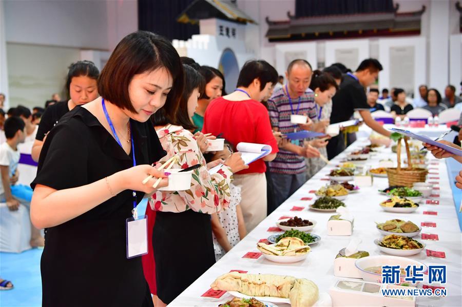 8月3日,在乡村美食文化大赛现场,评委在对菜品进行评定。